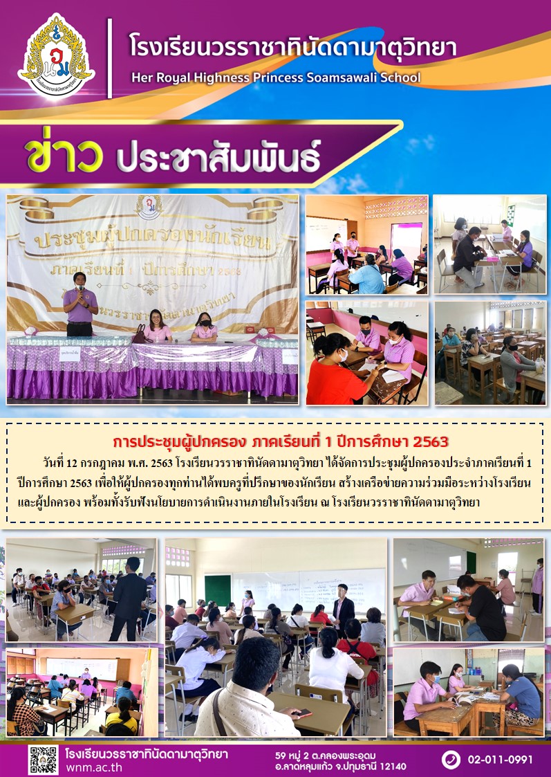 วันที่ 12 กรกฎาคม พ.ศ. 2563 โรงเรียนวรราชาทินัดดามาตุวิทยา ได้จัดการประชุมผู้ปกครองประจำภาคเรียนที่ 1 ปีการศึกษา 2563 เพื่อให้ผู้ปกครองทุกท่านได้พบครูที่ปรึกษาของนักเรียน สร้างเครือข่ายความร่วมมือระหว่างโรงเรียนและผู้ปกครอง พร้อมทั้งรับฟังนโยบายการดำเนินงานภายในโรงเรียน ณ โรงเรียนวรราชาทินัดดามาตุวิทยา