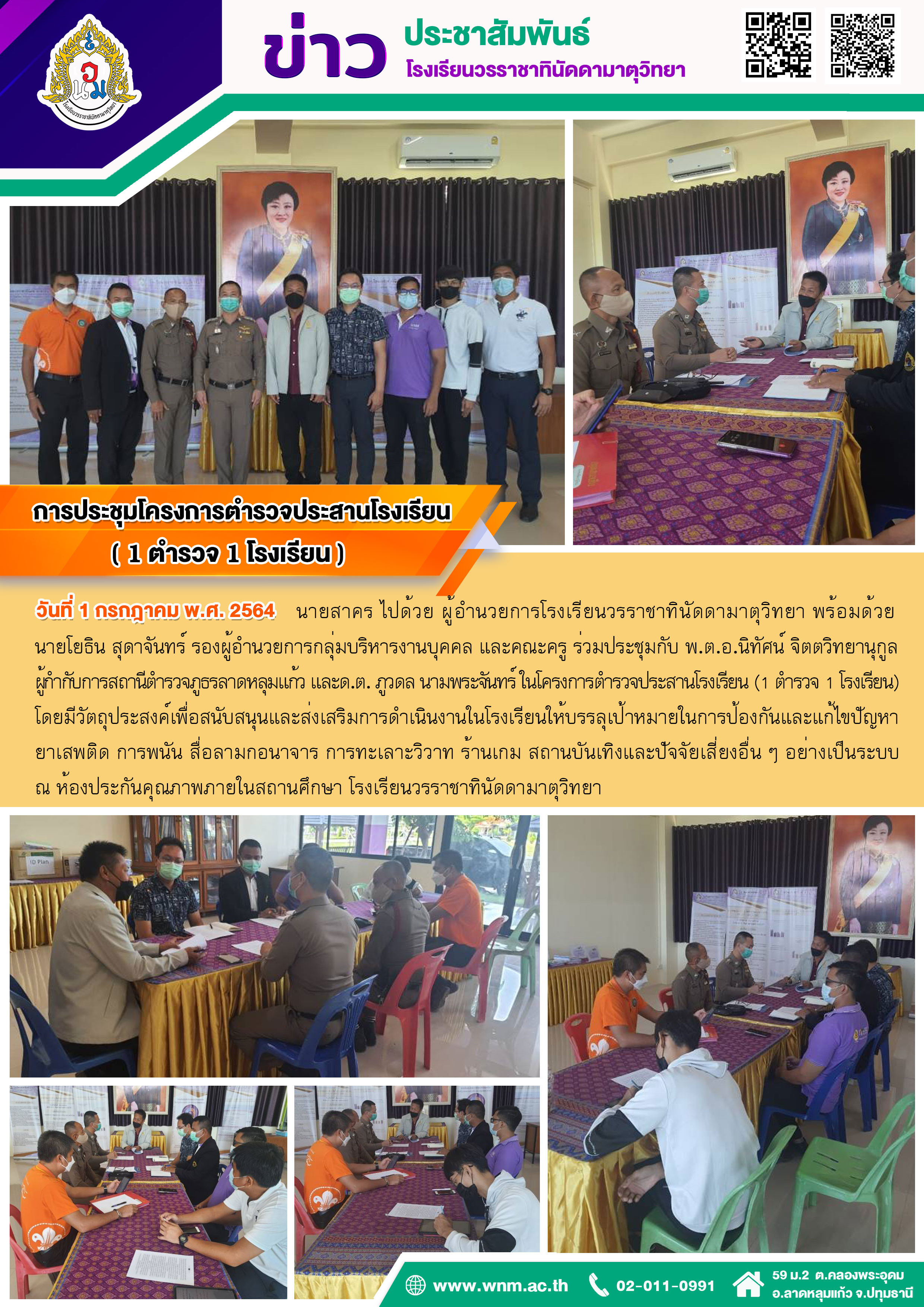 วันที่ 1 กรกฎาคม พ.ศ. 2564 นายสาคร ไปด้วย ผู้อำนวยการโรงเรียนวรราชาทินัดดามาตุวิทยา พร้อมด้วย นายโยธิน สุดาจันทร์ รองผู้อำนวยการกลุ่มบริหารงานบุคคล และคณะครู ร่วมประชุมกับ พ.ต.อ.นิทัศน์ จิตตวิทยานุกูล ผู้กำกับการสถานีตำรวจภูธรลาดหลุมแก้ว และด.ต. ภูวดล นามพระจันทร์ ในโครงการตำรวจประสานโรงเรียน (1 ตำรวจ 1 โรงเรียน) โดยมีวัตถุประสงค์เพื่อสนับสนุนและส่งเสริมการดำเนินงานในโรงเรียนให้บรรลุเป้าหมายในการป้องกันและแก้ไขปัญหายาเสพติด การพนัน สื่อลามกอนาจาร การทะเลาะวิวาท ร้านเกม สถานบันเทิงและปัจจัยเสี่ยงอื่น ๆ อย่างเป็นระบบ ณ ห้องประกันคุณภาพภายในสถานศึกษา โรงเรียนวรราชาทินัดดามาตุวิทยา