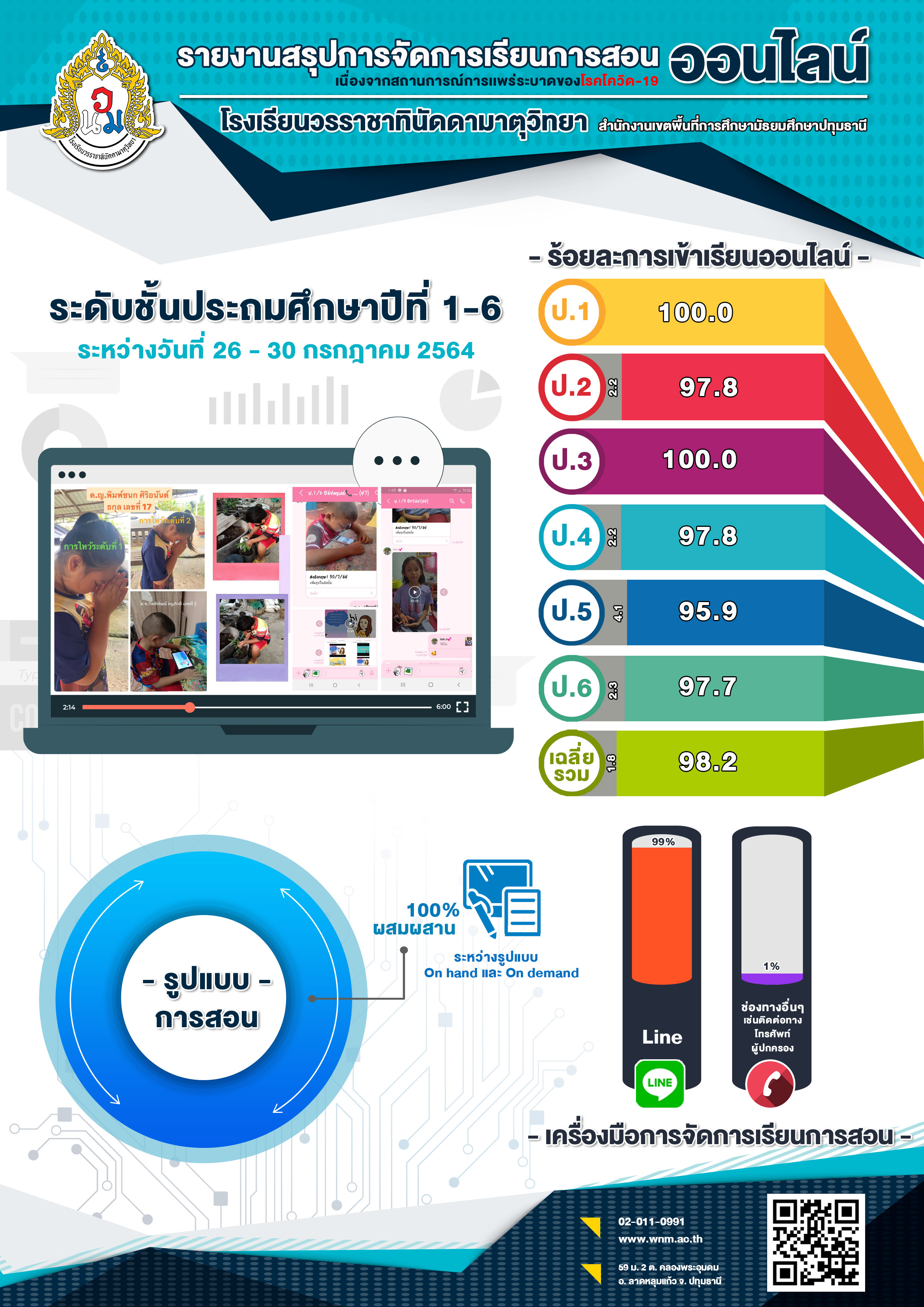 รายงานสรุปการจัดการเรียนการสอนออนไลน์ เนื่องจากสถานการณ์การแพร่ระบาดของโรคโควิด-19 โรงเรียนวรราชาทินัดดามาตุวิทยา ระดับชั้นประถมศึกษาปีที่ 1-6 ระหว่างวันที่ 26-30 กรกฎาคม 2564