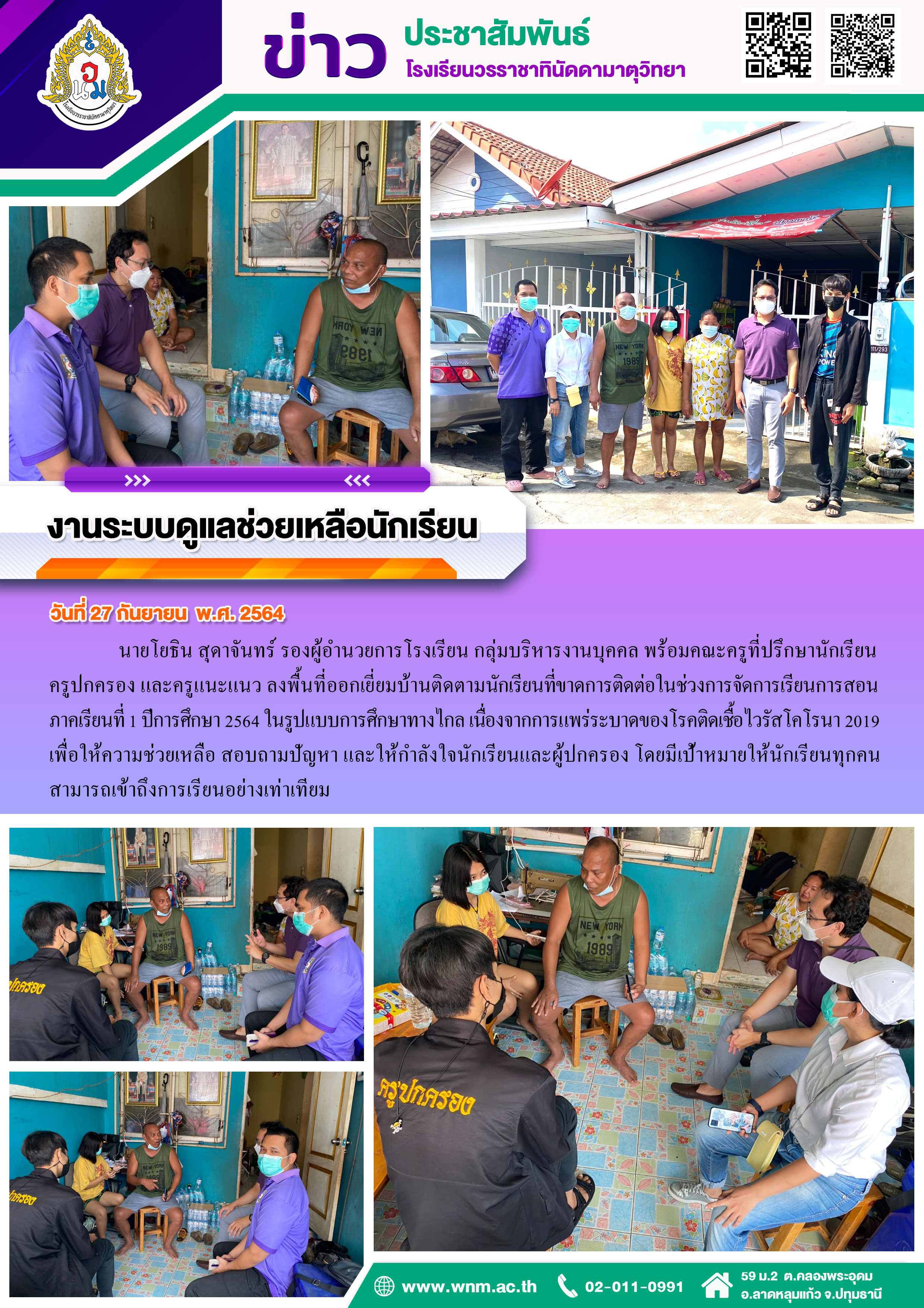 วันที่ 27 กันยายน พ.ศ. 2564 นายโยธิน สุดาจันทร์ รองผู้อำนวยการโรงเรียน กลุ่มบริหารงานบุคคล พร้อมคณะครูที่ปรึกษานักเรียน ครูปกครอง และครูแนะแนว ลงพื้นที่ออกเยี่ยมบ้านติดตามนักเรียนที่ขาดการติดต่อในช่วงการจัดการเรียนการสอน ภาคเรียนที่ 1 ปีการศึกษา 2564 ในรูปแบบการศึกษาทางไกล เนื่องจากการแพร่ระบาดของโรคติดเชื้อไวรัสโคโรนา 2019 เพื่อให้ความช่วยเหลือ สอบถามปัญหา และให้กำลังใจนักเรียนและผู้ปกครอง โดยมีเป้าหมายให้นักเรียนทุกคนสามารถเข้าถึงการเรียนอย่างเท่าเทียม