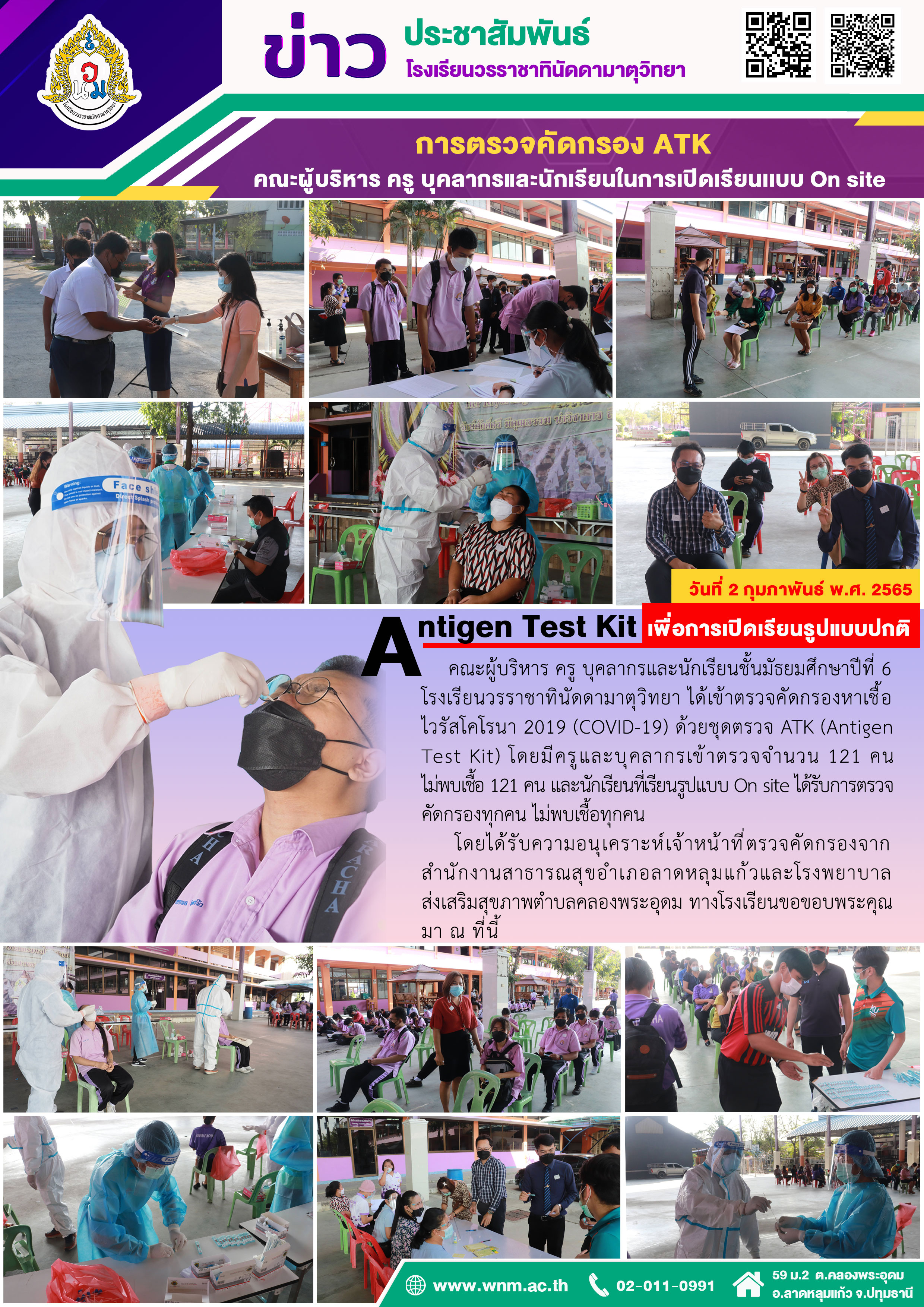 วันที่ 2 กุมภาพันธ์ พ.ศ. 2565 คณะผู้บริหาร ครู บุคลากรและนักเรียนชั้นมัธยมศึกษาปีที่ 6 โรงเรียนวรราชาทินัดดามาตุวิทยา ได้เข้าตรวจคัดกรองหาเชื้อไวรัสโคโรนา 2019 (COVID-19) ด้วยชุดตรวจ ATK (Antigen Test Kit) โดยมีครูและบุคลากรเข้าตรวจจำนวน 121 คน ไม่พบเชื้อ 121 คน และนักเรียนที่เรียนรูปแบบ On site ได้รับการตรวจคัดกรองทุกคน ไม่พบเชื้อทุกคน โดยได้รับความอนุเคราะห์เจ้าหน้าที่ตรวจคัดกรองจากสำนักงานสาธารณสุขอำเภอลาดหลุมแก้ว และโรงพยาบาลส่งเสริมสุขภาพตำบลคลองพระอุดม ทางโรงเรียนขอขอบพระคุณมา ณ ที่นี้