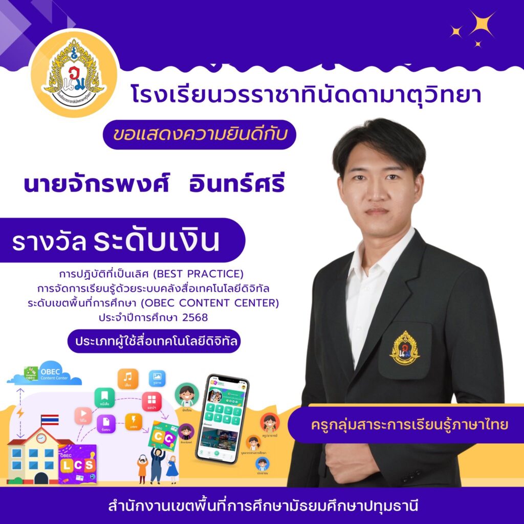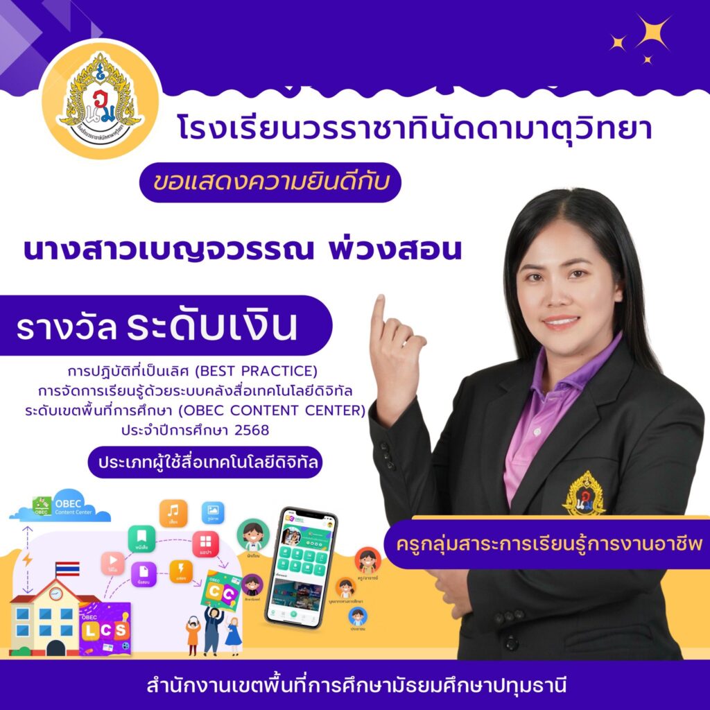 การปฏิบัติที่เป็นเลิศ (Best practice) การจัดการเรียนรู้ด้วยระบบสื่อเทคโนโลยีดิจิทัล 11 ธันวาคม 256811 ธันวาคม 2025 WNM Admin ผลงานนักเรียน/ครู ขอแสดงความยินดีกับคุณครูผู้ได้รับรางวัลการปฏิบัติที่เป็นเลิศ (Best practice ) การจัดการเรียนรู้ด้วยระบบสื่อเทคโนโลยีดิจิทัล ระดับเขตพื้นที่การศึกษา (OBEC CONTENT CENTER ) ประจำปีการศึกษา 2568 ประเภทผู้ใช้สื่อเทคโนโลยีดิจิทัล WNM Admin