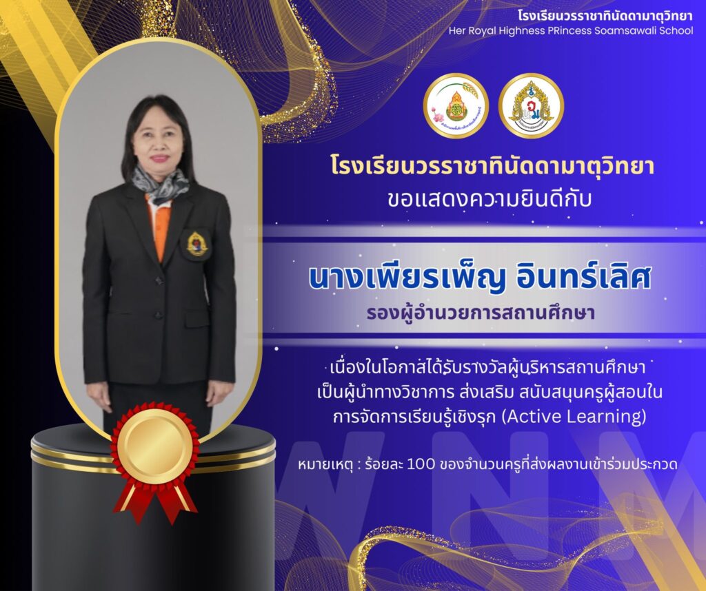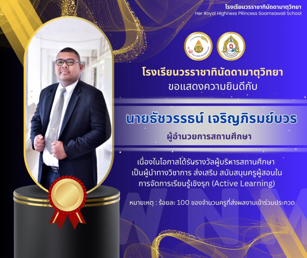 รางวัลผู้บริหารสถานศึกษา เป็นผู้นำวิชาการการจัดการเรียนรู้เชิงรุก (Active Learning) 11 ธันวาคม 256811 ธันวาคม 2025 WNM Admin ผลงานนักเรียน/ครู นายธัชวรรธน์ เจริญภิรมย์บวร ผู้อำนวยการโรงเรียนวรราชาทินัดดามาตุวิทยา และนางเพียรเพ็ญ อินทร์เลิศ รองผู้อำนวยการสถานศึกษา ได้รับรางวัลผู้บริหารสถานศึกษา เป็นผู้นำวิชาการการจัดการเรียนรู้เชิงรุก (Active Learning) WNM Admin