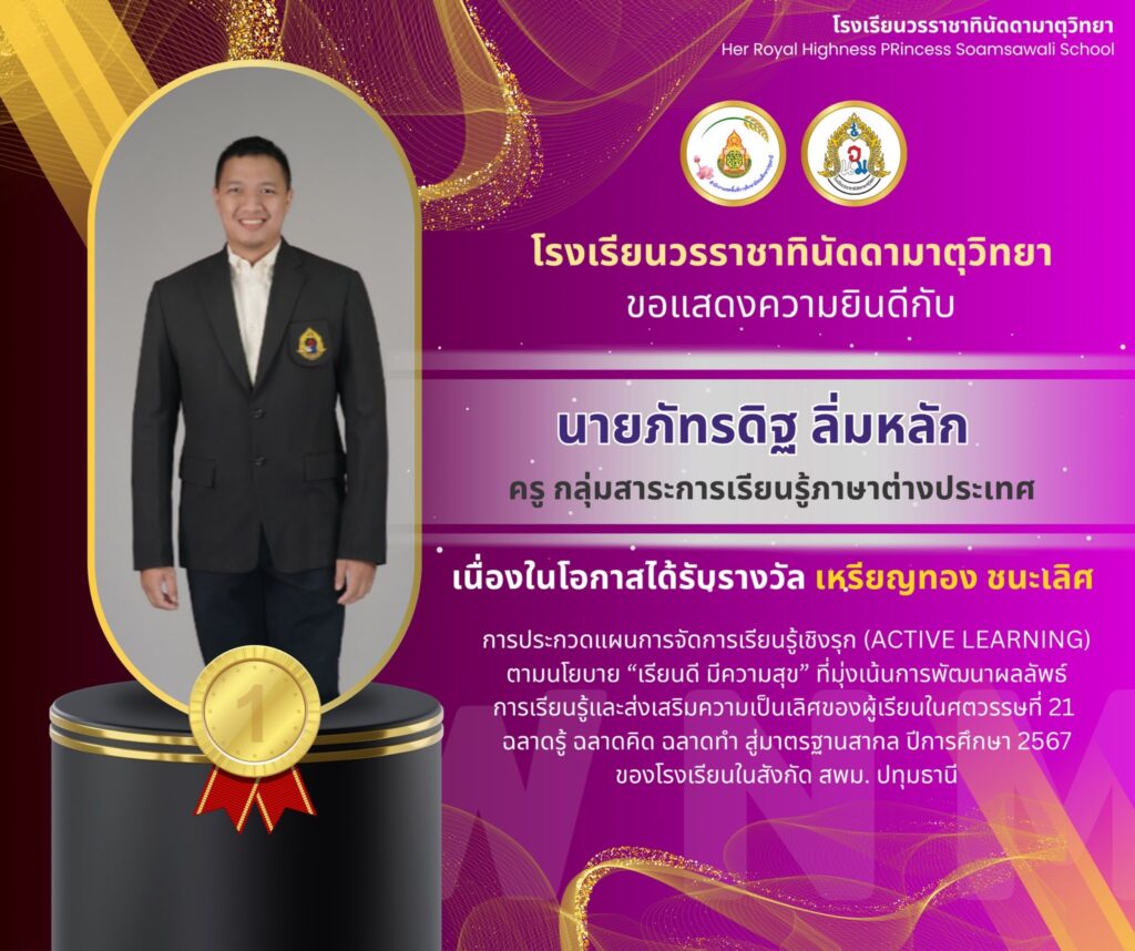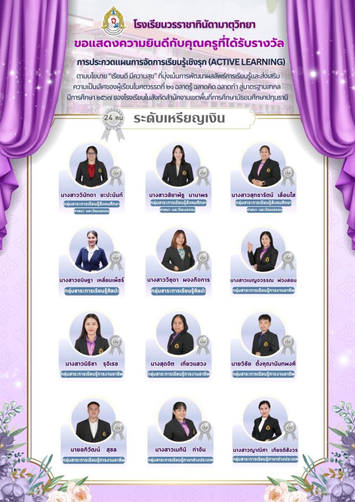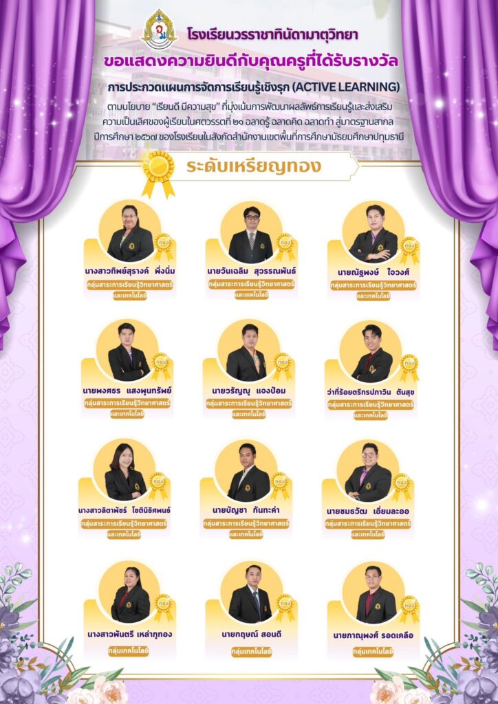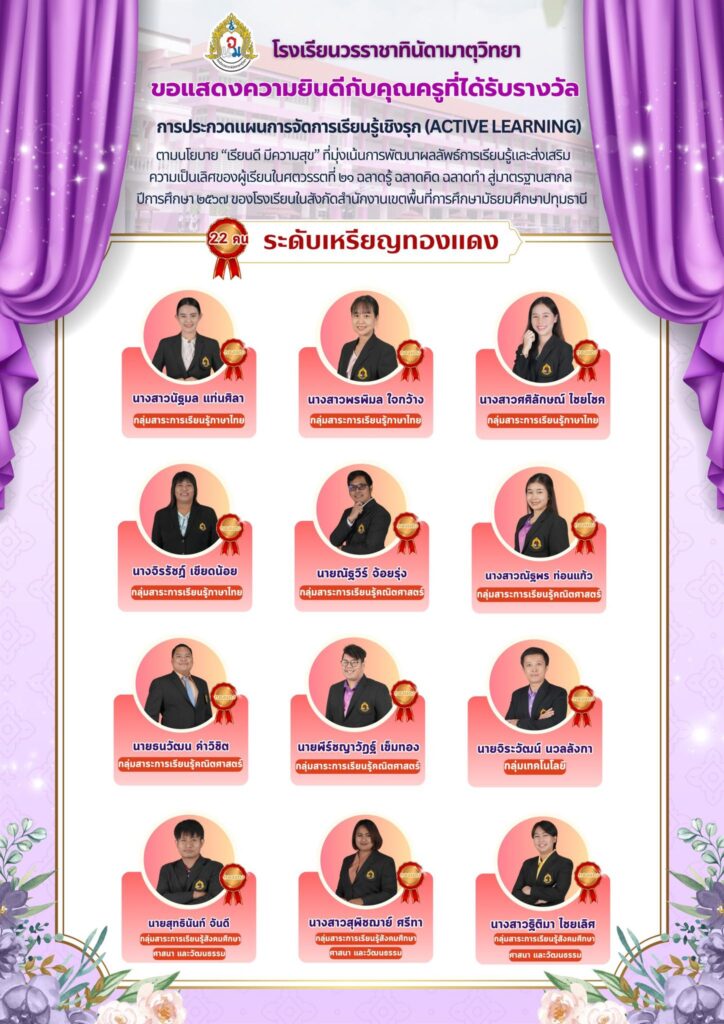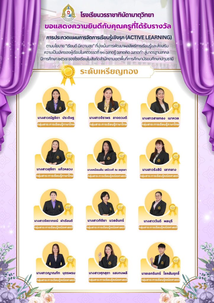 คณะครูได้รับรางวัลการประกวดแผนการจัดการเรียนรู้เชิงรุก (Active Learning) 11 ธันวาคม 256811 ธันวาคม 2025 WNM Admin ผลงานนักเรียน/ครู คณะครูโรงเรียนวรราชาทินัดดามาตุวิทยา ได้รับรางวัลการประกวดแผนการจัดการเรียนรู้เชิงรุก (Active Learning) จัดโดยสำนักงานเขตพื้นที่การศึกษามัธยมศึกษาปทุมธานี WNM Admin