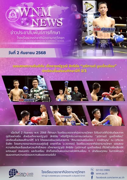 เมื่อวันที่ 2 กันยายน พ.ศ. 2568 ที่ผ่านมา โรงเรียนวรราชาทินัดดามาตุวิทยา ได้รับข่าวดีที่น่ายินดีและภาคภูมิใจอย่างยิ่ง สำหรับเด็กชายณัฐวุฒิ สิทธิชัย หรือที่รู้จักในวงการมวยในนาม “วุฒิกานต์ บูมเด็กเซียน” นักเรียนชั้นมัธยมศึกษาปีที่ 3/3 ได้ลงแข่งขันมวยในรายการ “ศึกมวยมันสนั่นเมือง + ภ.หลักบุญ” ณ เวทีมวยรังสิต โดยสามารถเอาชนะคะแนนคู่ต่อสู้ นายกก๋วย บ.วราภรณ์ โรงเรียนวรราชาทินัดดามาตุวิทยา ขอแสดงความยินดีและชื่นชมในความสำเร็จของ เด็กชายณัฐวุฒิ สิทธิชัย (วุฒิกานต์ บูมเด็กเซียน) ที่ได้สร้างชื่อเสียงให้แก่ตนเอง ครอบครัว และโรงเรียน อีกทั้งยังเป็นแรงบันดาลใจให้กับเพื่อน ๆ นักเรียนทุกคน ในการพัฒนาตนเองตามความถนัดและความฝันของตนต่อไป