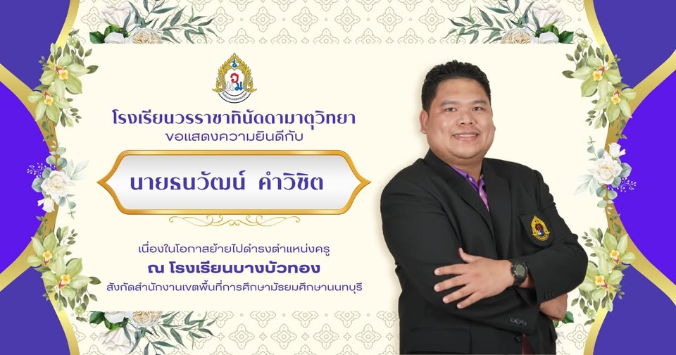 ขอแสดงความยินดีกับ นายธนวัฒน์ คำวิชิต 2 กุมภาพันธ์ 25692 กุมภาพันธ์ 2026 WNM Admin ข่าวประชาสัมพันธ์ โรงเรียนวรราชาทินัดดามาตุวิทยา ขอแสดงความยินดีกับ นายธนวัฒน์ คำวิชิต เนื่องในโอกาสย้ายไปดำรงตำแหน่ง ครู ณ โรงเรียนบางบัวทอง สังกัดสำนักงานเขตพื้นที่การศึกษามัธยมศึกษานนทบุรี WNM Admin