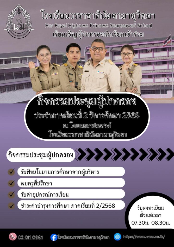 กิจกรรมประชุมผู้ปกครอง ภาคเรียนที่ 2 ปีการศึกษา 2568 2 กุมภาพันธ์ 25692 กุมภาพันธ์ 2026 WNM Admin ข่าวประชาสัมพันธ์ เรียนเชิญผู้ปกครองนักเรียนทุกท่านเข้าร่วมประชุมผู้ปกครอง ภาคเรียนที่ 2 ปีการศึกษา 2568 ในวันที่ 2 พฤศจิกายน พ.ศ. 2568 เริ่มลงทะเบียนตั้งแต่เวลา 7:30 – 8:30 น. ณ โดมอเนกประสงค์โรงเรียนวรชาทินัดดามาตุวิทยา WNM Admin