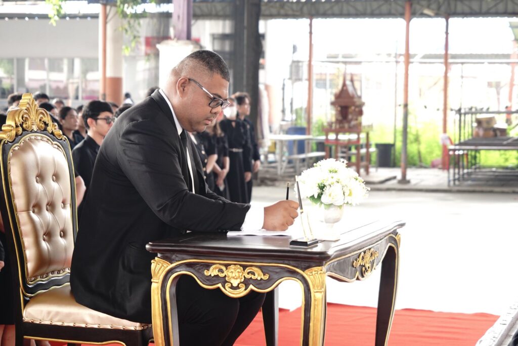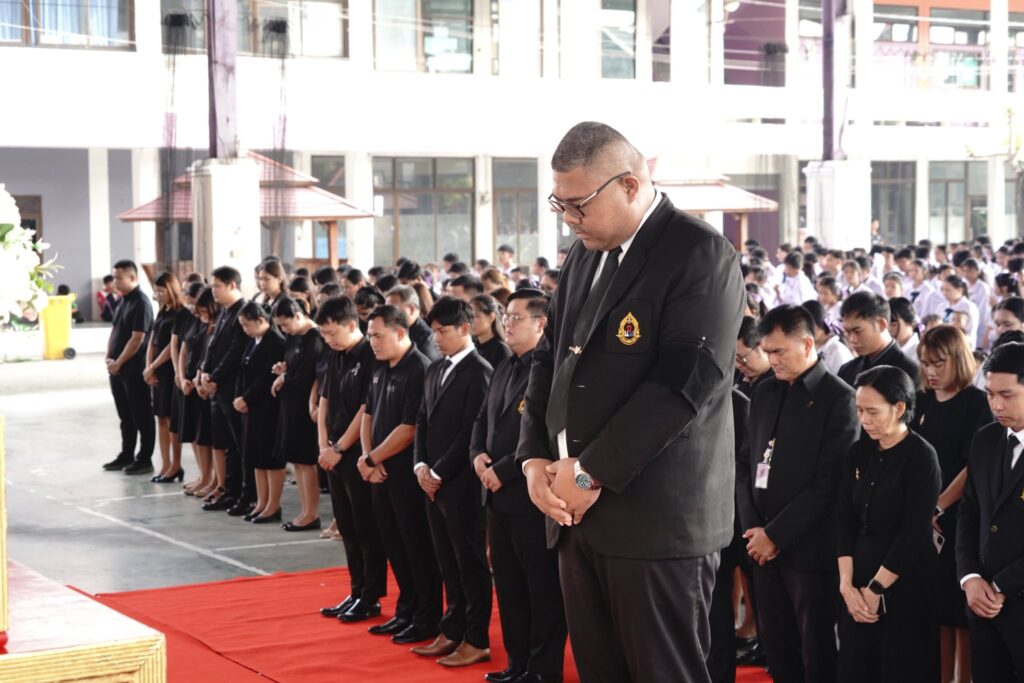 โดยท่านผู้อำนวยการได้จุดธูปเทียนเครื่องทองน้อยเบื้องหน้าพระบรมฉายาลักษณ์ กล่าวคำถวายอาลัย พร้อมทั้งนำผู้ร่วมพิธี ยืนสงบนิ่งเป็นเวลา 1 นาที เพื่อแสดงความอาลัยและน้อมรำลึกในพระมหากรุณาธิคุณอันหาที่สุดมิได้